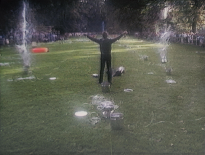 Auf der Unterseite signiert und datiert: Roman 1987, sowie teils unleserlich datiert, bezeichnet, mit Ortsangabe und Widmung: Aktion im Stadtpark St. Gallen 12. (....) 1987 Für H. Hefti